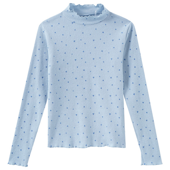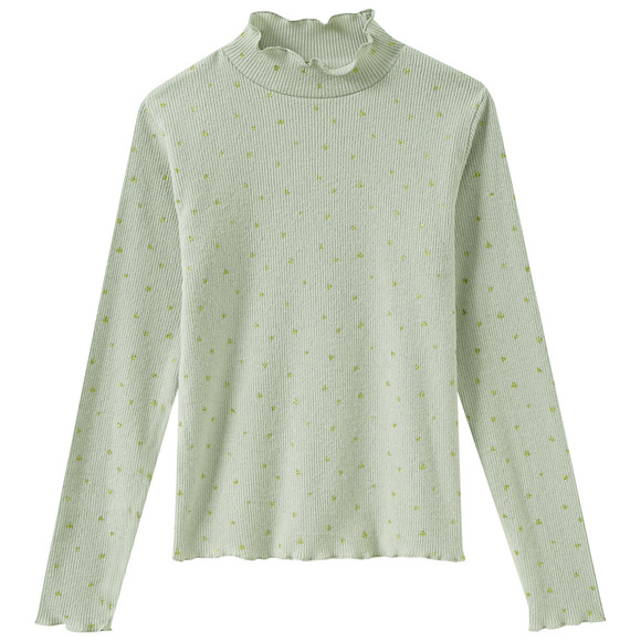 Hellgrünes Langarmshirt mit Rippstruktur und kleinen, glitzernden Herzen allover. Mit Stehkragen und gewellten Bündchen an allen Ausschnitten. Angenehme, weiche Qualität. Figurnah geschnitten.