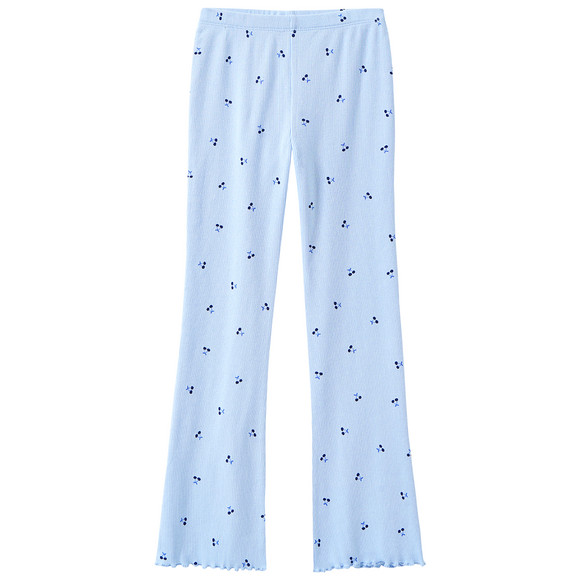 Leggings in Hellblau mit Rippstruktur und Kirsch-Print allover bedruckt. Mit Elastikbund für einen optimalen Sitz und Wellenbündchen an den ausgestellten Beinausschnitten.