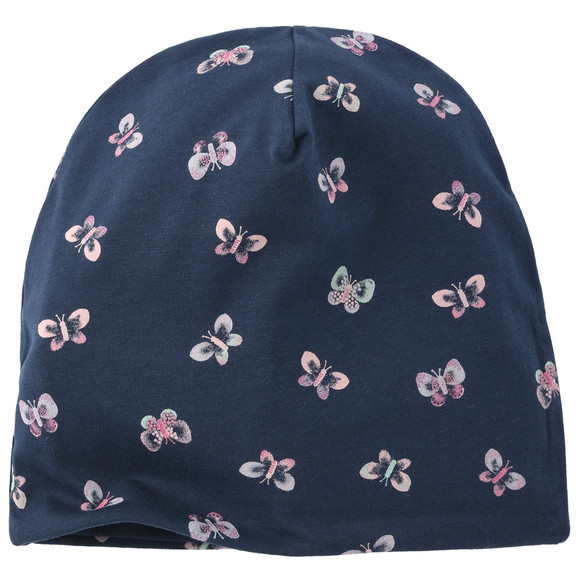 Dunkelblaue Mütze in Beanie-Style  mit Schmetterling-Print Allover. Doppellagig gearbeitet aus Baumwolljersey mit unifarbener Innenseite.