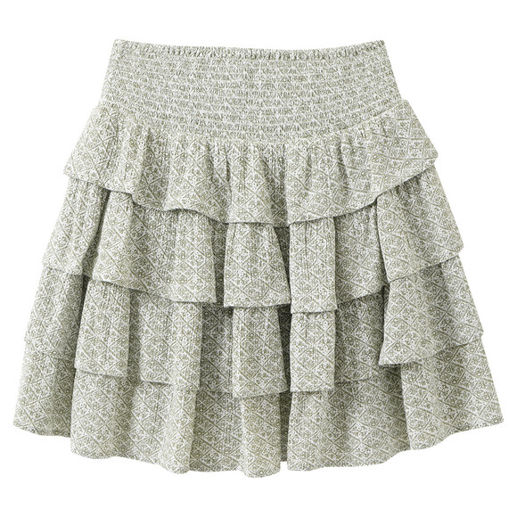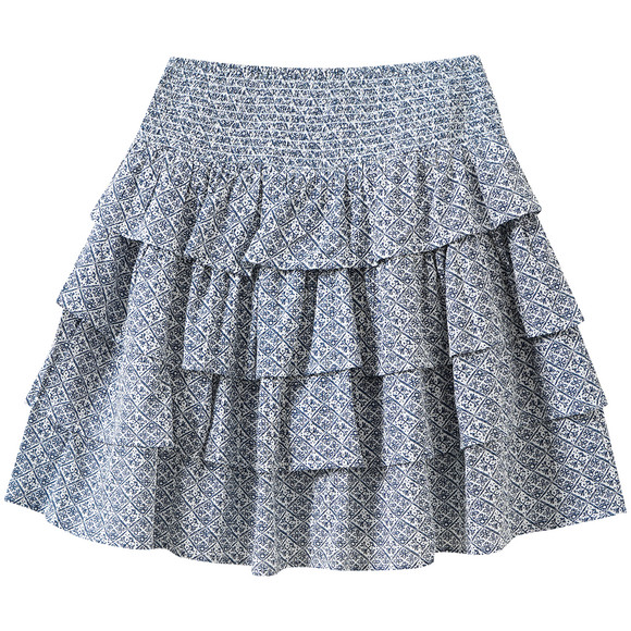 Weißer Rock aus vier Lagen mit grafischem Muster in Dunkelblau. Mit eingenähter Shorts und breitem elastischen Bund für bequemen Sitz.