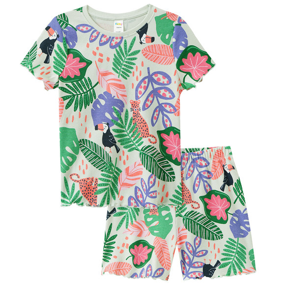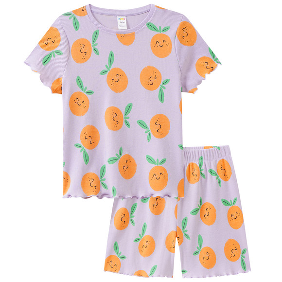 Helllila Shorty mit lachenden Orangen allover. Mit feiner Rippstruktur und Wellenbündchen an den Ausschnitten und am Saum. Shirt mit Rundhalsausschnitt und Hose mit Elastikbund.