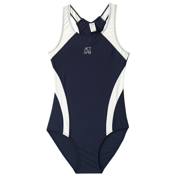 Dunkelblauer Badeanzug mit weißen Einsätzen an den Seiten. Kleiner gummierter Schriftzug auf Brusthöhe. Breite Träger und Ringerrücken für einen guten Sitz. Elastische Beinausschnitte für hohen Tragekomfort. Vorne und im Schritt gefüttert.