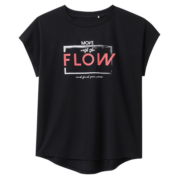 Pinkes Sport-T-Shirt aus glattem Funktionsmaterial mit Lyocell. Mit Rundhalsausschnitt, überschnittenen Schultern und Schriftzug vorne. Saum leicht gerundet. Schnell trocknend und atmungsaktiv.