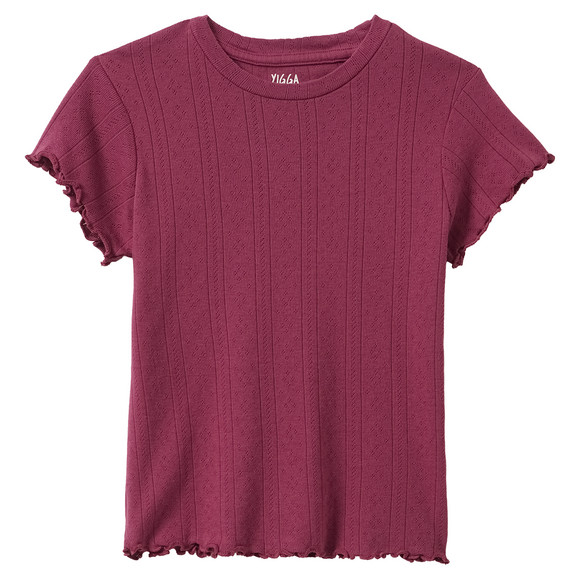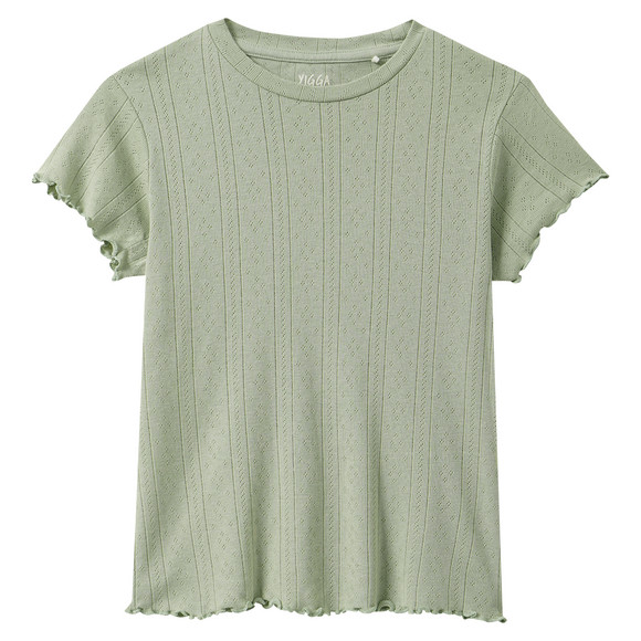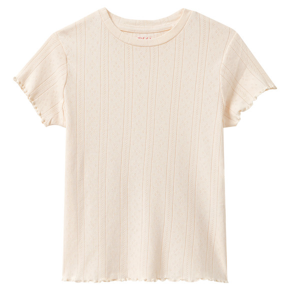Cremefarbenes T-Shirt aus Baumwolle mit Ajour-Muster allover. Mit Rundhalsausschnitt und Wellenbündchen an den Armausschnitten sowie am Saum.