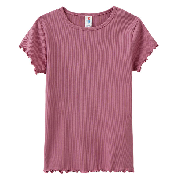 Dunkelrosa T-Shirt mit feiner Rippstruktur und hohem Anteil zertifizierter Bio-Baumwolle. Mit paspeliertem Rundhalsausschnitt und Wellenbündchen an den Ärmeln und am Saum.