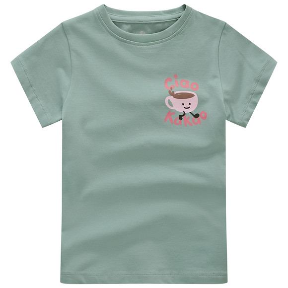 Dunkellila T-Shirt mit witzigem Frühstücks-Motiv mit Croissant, Tasse und Schriftzug "Mama's coffee date" auf der Front. Mit feinem Bündchen am Rundhalsausschnitt. Gerader Basic-Schnitt.