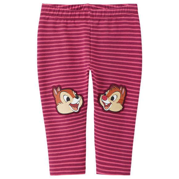 Rosa-dunkelrosa gestreifte Leggings mit angenehmer Bio-Baumwolle. Oben mit Elastikbund und auf dem Knie mit "Minnie Maus"-Applikation.