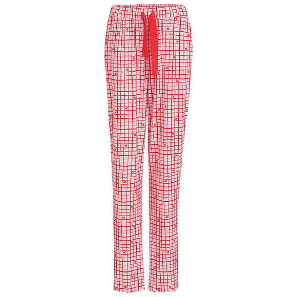 Happy dreams! Pinke Schlafhose aus einem Viskose-Mix mit "Minnie Maus"-Motiven und rotem Karomuster. Mit rotem Tunnelzugband im Elastikbund.