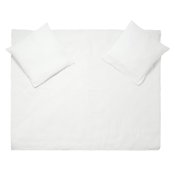 Gut geschlafen! Unifarbene Musselin Bettwäsche in Weiß mit zwei Kissenbezügen. Aus angenehmer Bio-Baumwolle. Kissen mit Hotelverschluss und Decke mit Knöpfen. Maße Kopfkissen ca. 80 x 80 cm (BxH). Maße Bettdecke ca. 240 x 220 cm (BxL).