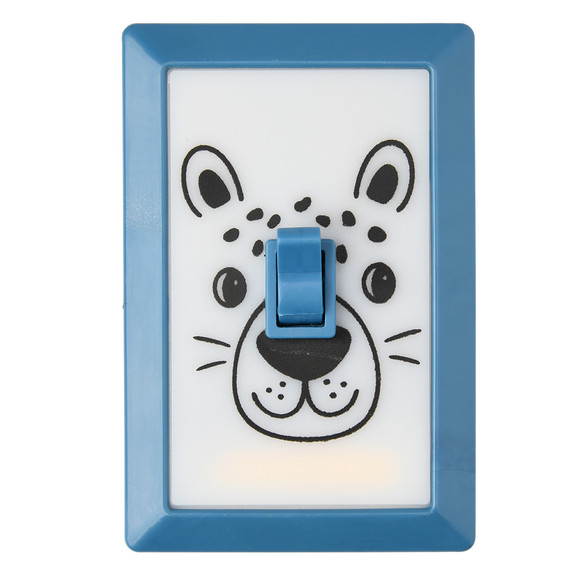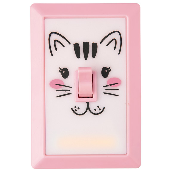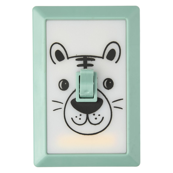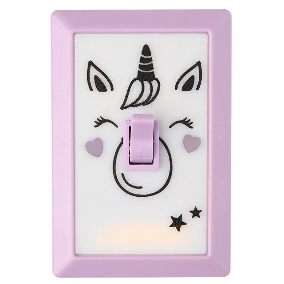 Rechteckige LED-Nachtlampe mit lila Rahmen und Einhorn-Gesicht als Motiv. Kindgerechter Ein- und Ausschalter mittig. Batteriefach auf der Rückseite (3x AAA LR03 (1.5V). Batterien nicht enthalten. Verschiedene Möglichkeiten zur Wandbefestigung (Haken, Magnet, Klett).