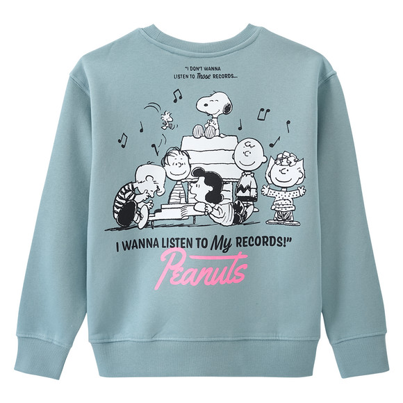 Hellblaues Sweatshirt mit Rippenbündchen am Rundhalsausschnitt, den Ärmeln und am Saum. Mit "Peanuts"-Print vorne auf der Brust und im Großformat auf dem Rücken. Innen kuschelig weich.