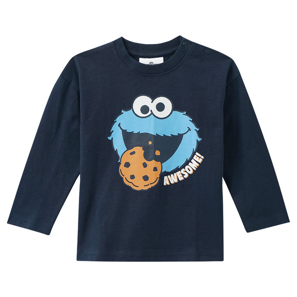 Hellblaues Langarmshirt aus Baumwolle mit großem Print vom "Krümelmonster" und "Elmo" aus der "Sesamstraße". Mit praktischer Schulterknöpfung und angesetztem Bündchen am Rundhalsausschnitt.