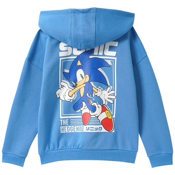 Hellblauer Hoodie mit Prints von "Sonic" auf der Brust, auf dem linken Ärmel und auf dem Rücken. Mit doppellagiger Kapuze, Kängurutasche, formstabilen Bündchen und innen kuschelig weich.