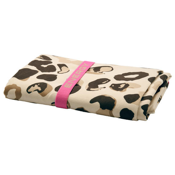 Ultrakompaktes Handtuch mit Leo-Muster aus besonders saugfähiger Mikrofaser, mit gesäumten Abschlüssen. Mit praktischer Elastikschlaufe für einfachen Transport und "Energy"-Schriftzug auf der Schlaufe.