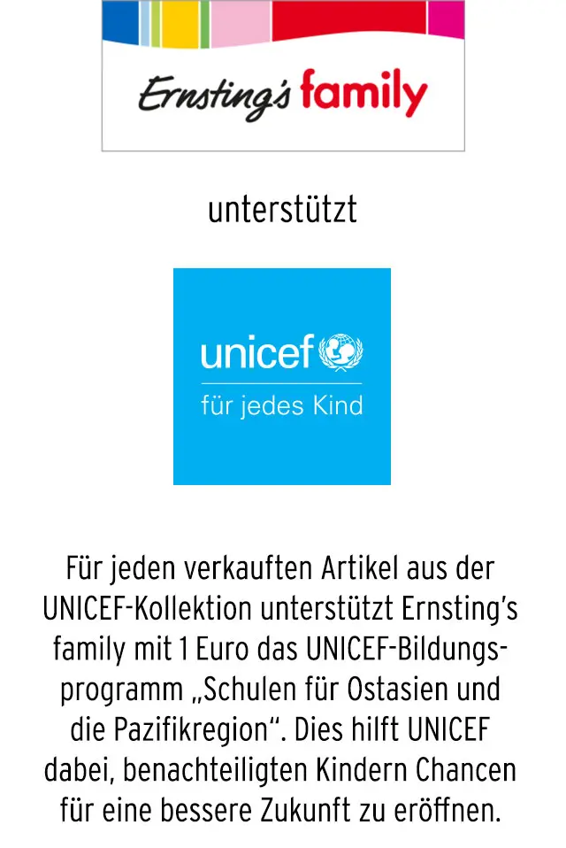 Für jeden verkauften Artikel aus der UNICEF-Kollektion unterstützt Ernsting’s family mit 1 Euro das UNICEF-Bildungsprogramm „Schulen für Ostasien und die Pazifikregion“. Dies hilft UNICEF dabei, benachteiligten Kindern Chancen für eine bessere Zukunft zu eröffnen. UNICEF bevorzugt keine Unternehmen, Marken, Produkte oder Dienstleistungen. Die abgebildeten Kinder erhalten keine Hilfe aus UNICEF-Programmen. Der Betrag pro verkauftem Produkt an UNICEF bleibt von Rabattierungen unberührt. Mehr Infos auf http://csr.ernstings-family.com. Aktionszeitraum: 27.02.2026 - 26.03.2026.