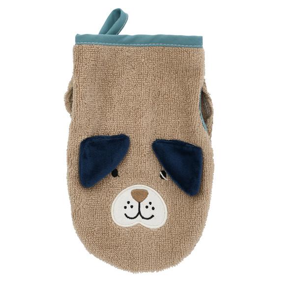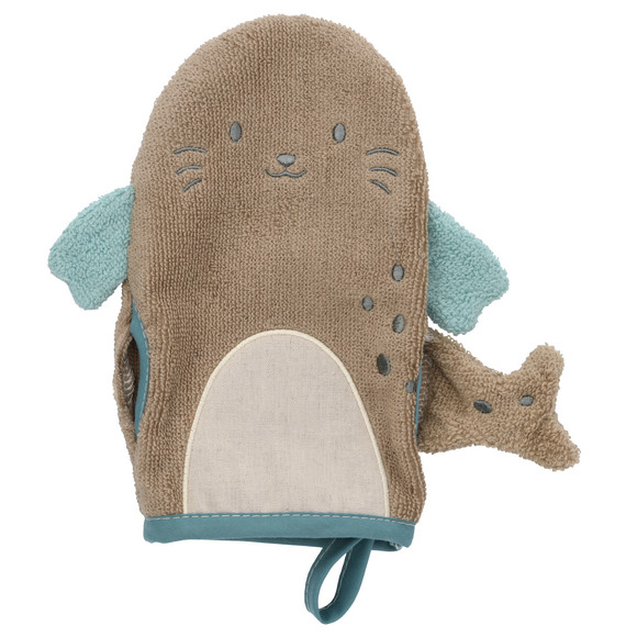 Hellbrauner Waschhandschuh im Seehund-Design mit seitlichem Daumenloch in weicher Qualität. Rundum gesäumt und mit praktischer Schlaufe zum Aufhängen.